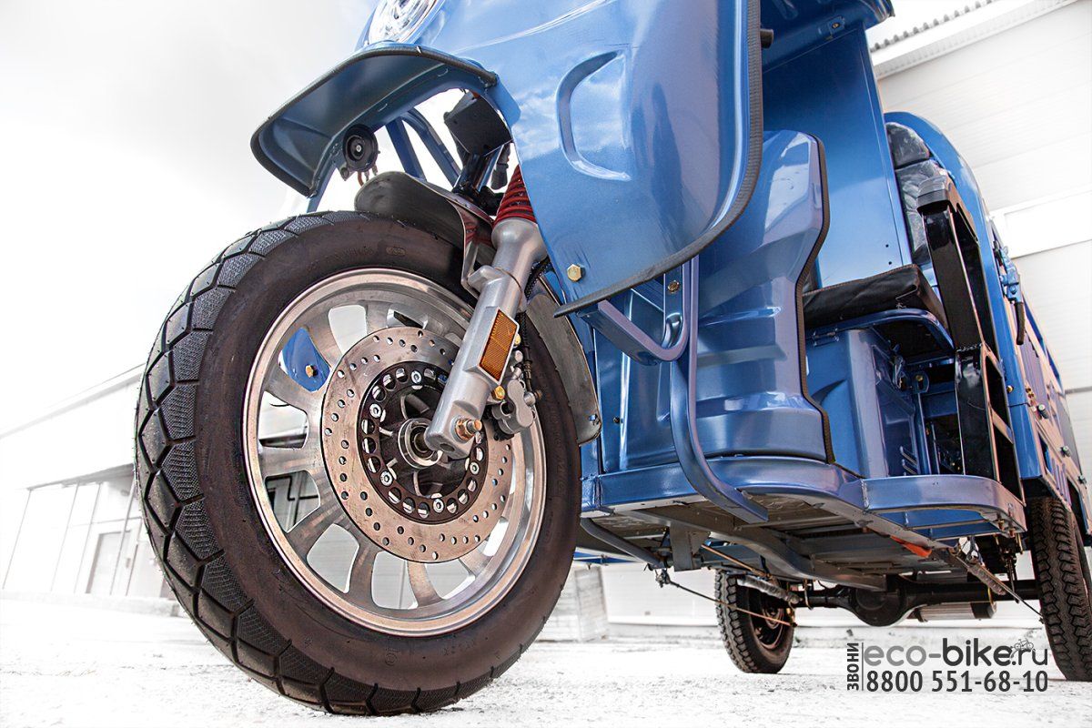 А ещё мы установили на Гермес PRO один из самых мощных моторов в серии: 2200 ватт - он способен питаться как от 60 Вольтового комплекта аккумуляторов, так и от напряжения в 72 Вольта (6 тяговых АКБ по 12 Вольт каждый). Ход и динамика трицикла необычайно плавные, а превосходная амортизация добавит комфорта в поездке. Также от младшей модели Rutrike Гермес трицикл отличает наличие переднего дискового гидравлического тормоза.